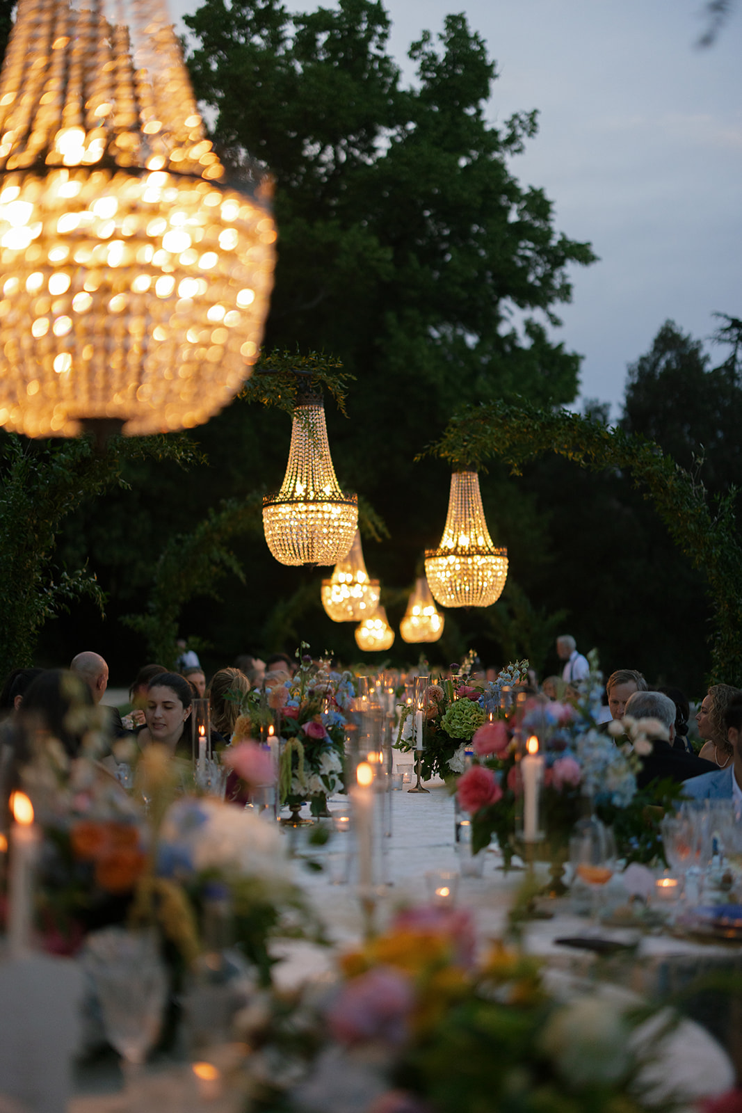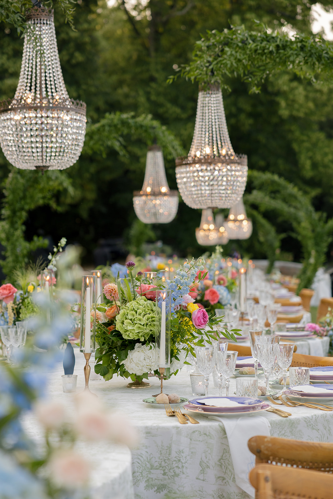 Guests were treated to an extraordinary outdoor dinner featuring a serpentine table design beneath greenery arches and sparkling crystal chandeliers. Toile linens, abundant florals, and gold-rimmed details elevated the atmosphere into pure luxury.
