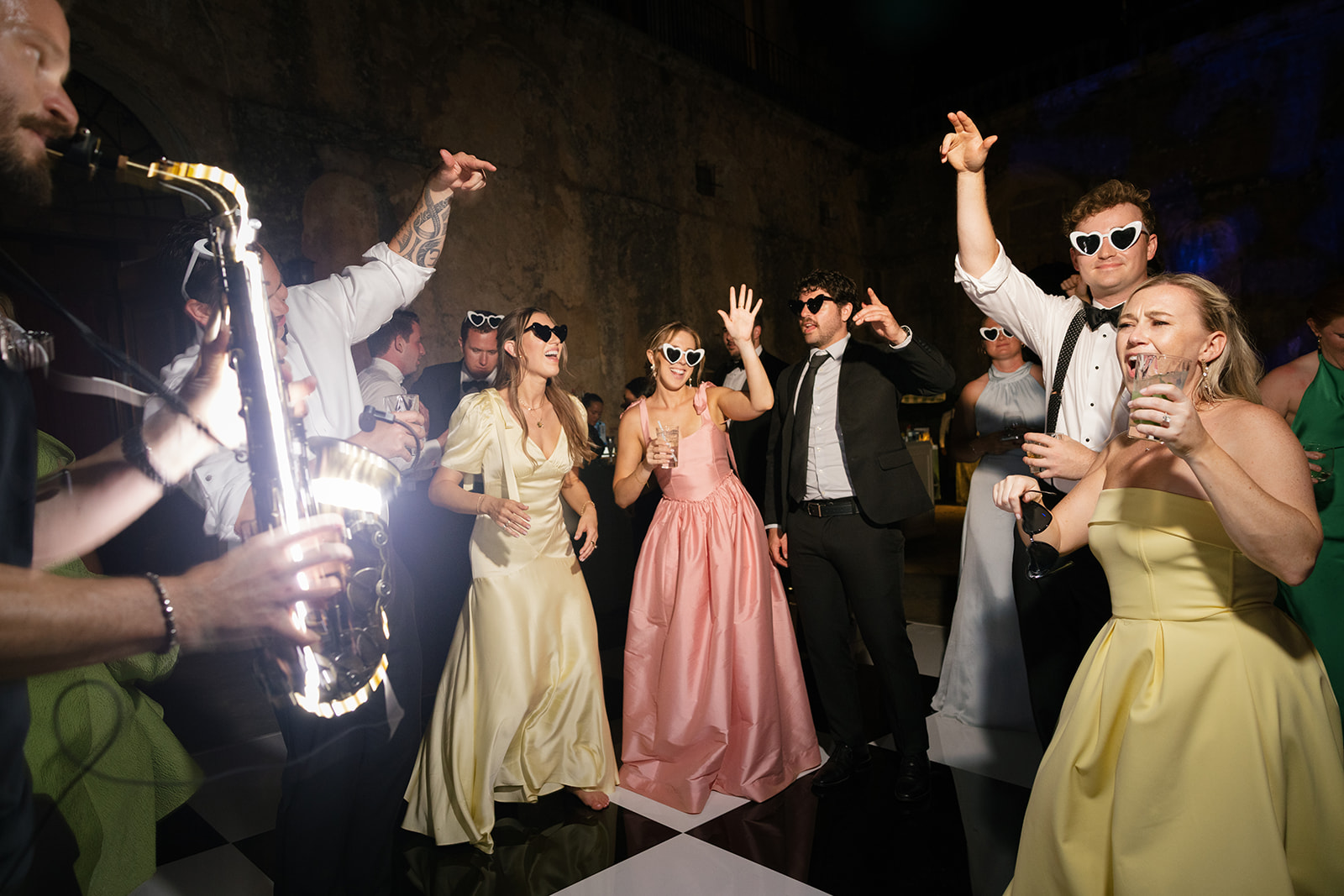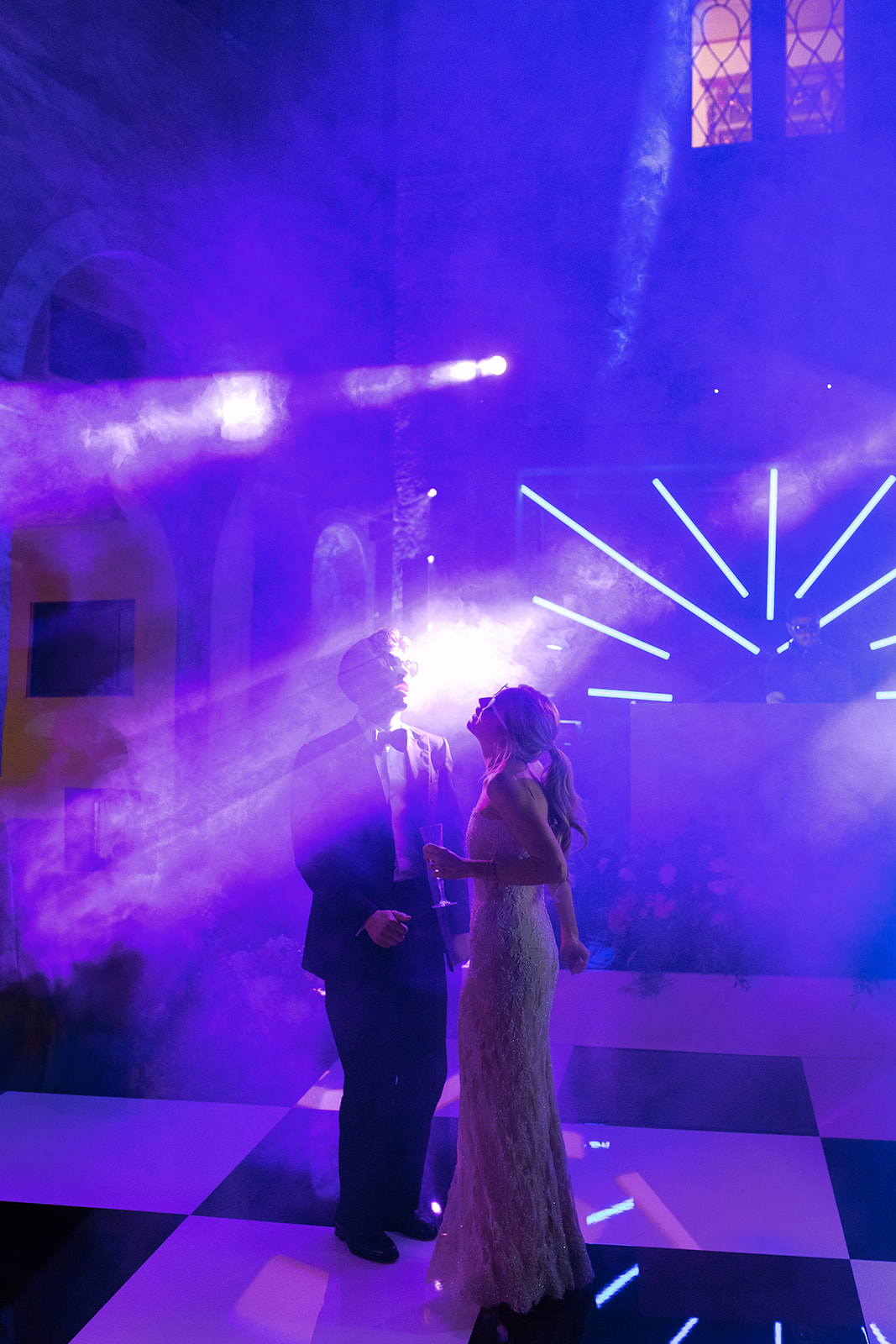 As the sun set, the celebration transformed into a high-energy party. A glossy black-and-white dance floor, dramatic lighting, lasers, and live musicians set the tone for an unforgettable night. Guests danced under the Tuscan sky while the couple celebrated with cocktails, music, and joyful energy that carried late into the night.