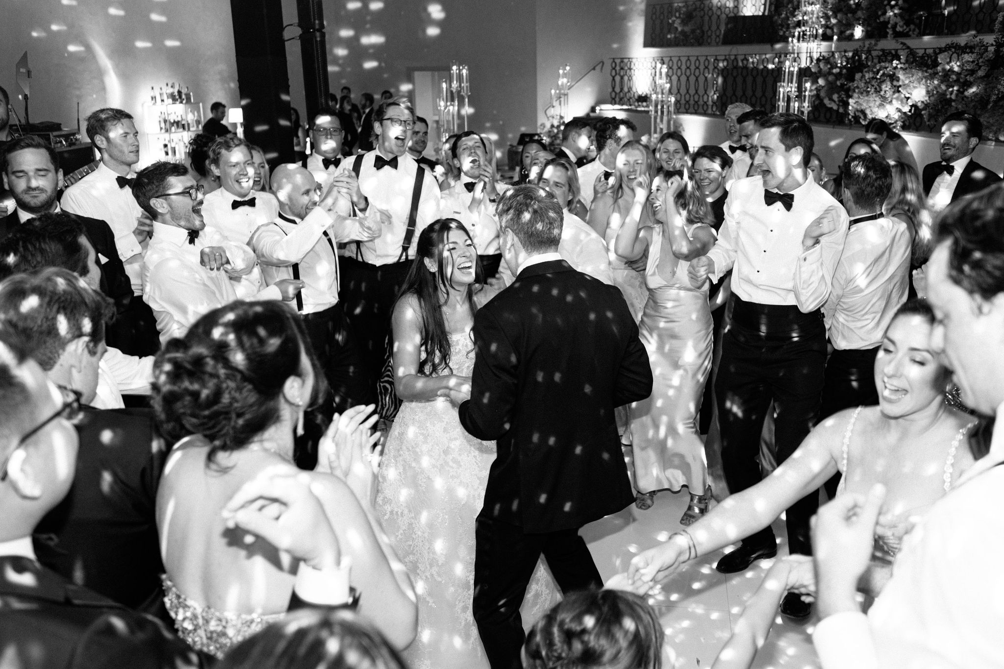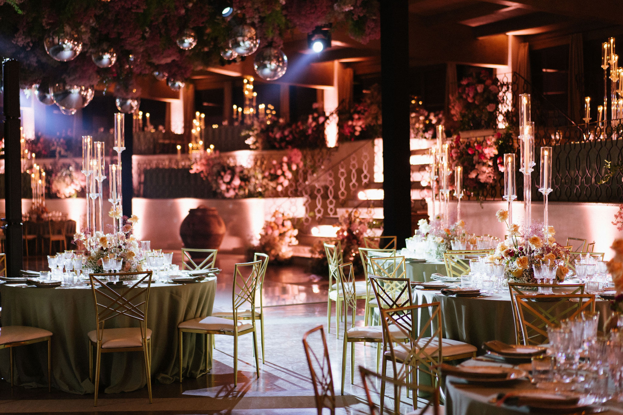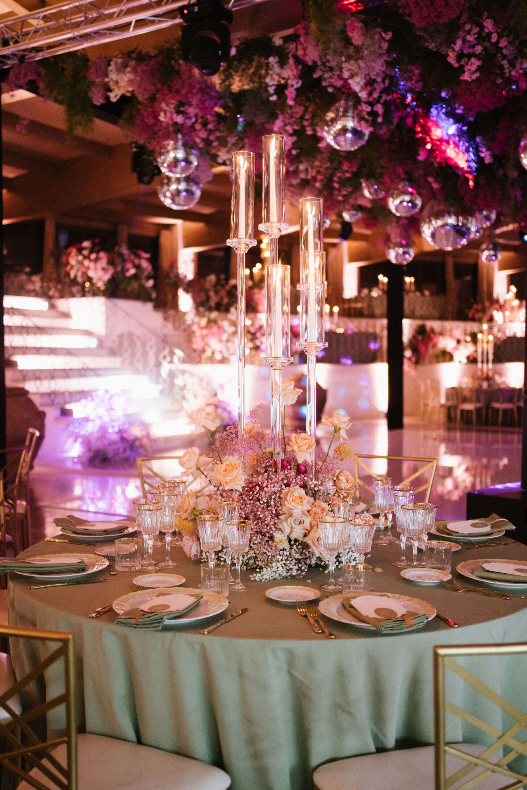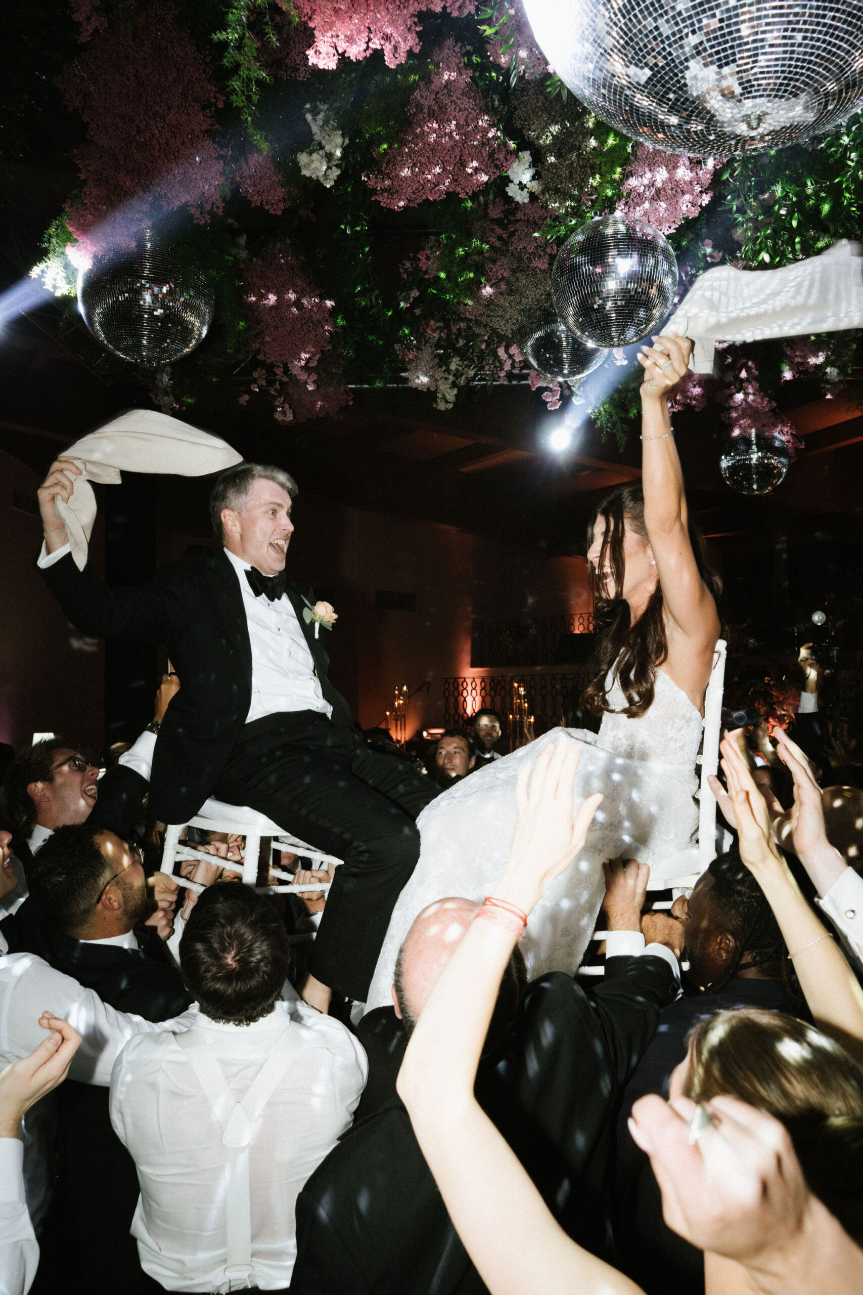As night fell, guests stepped into a modern yet romantic reception adorned with suspended florals, candlelight, and glowing disco balls. Sage linens, gold accents, and lush blooms created an atmosphere that was refined yet vibrant. The hora brought electrifying joy, lifting the couple high above the dance floor.