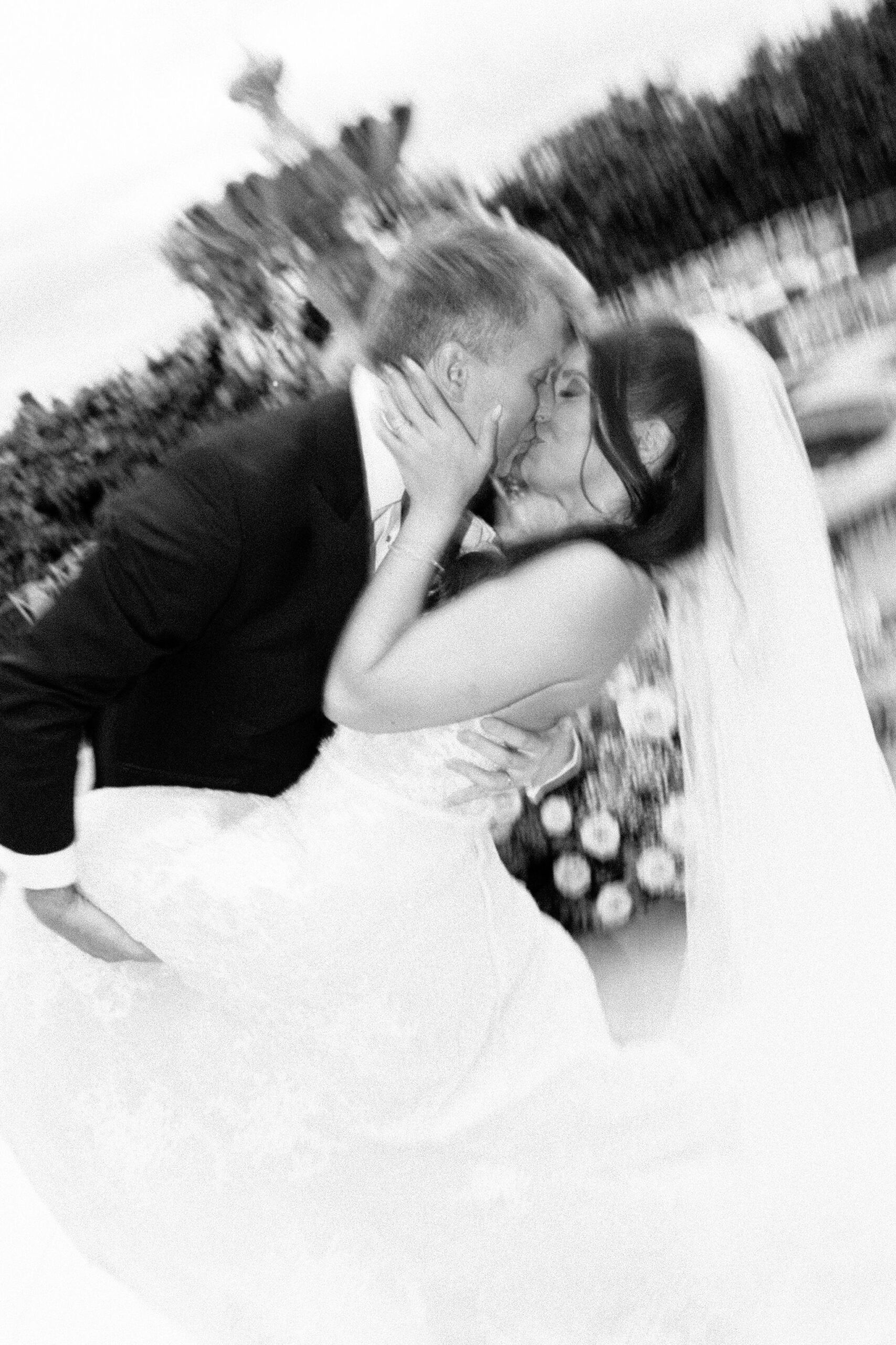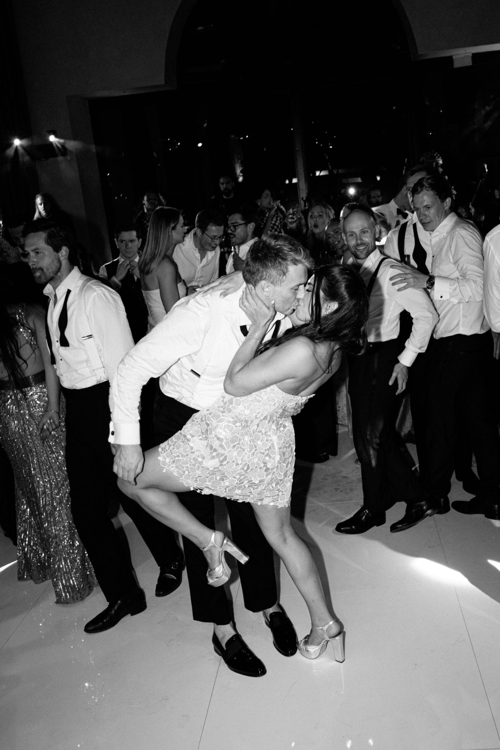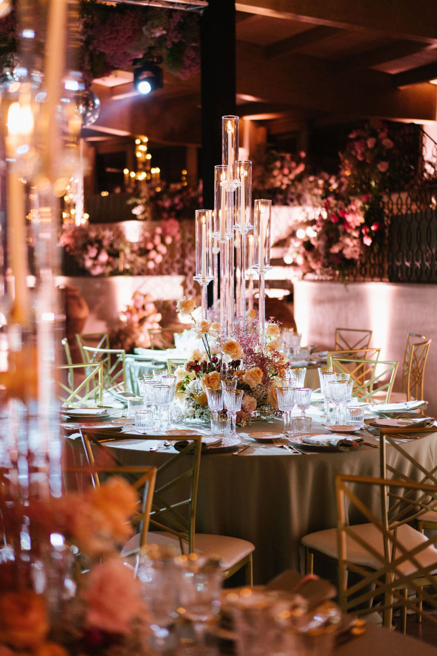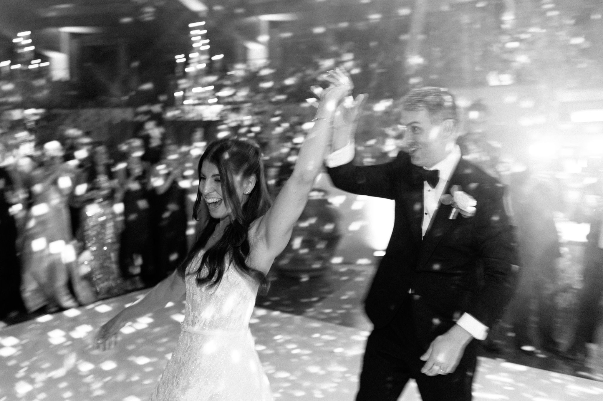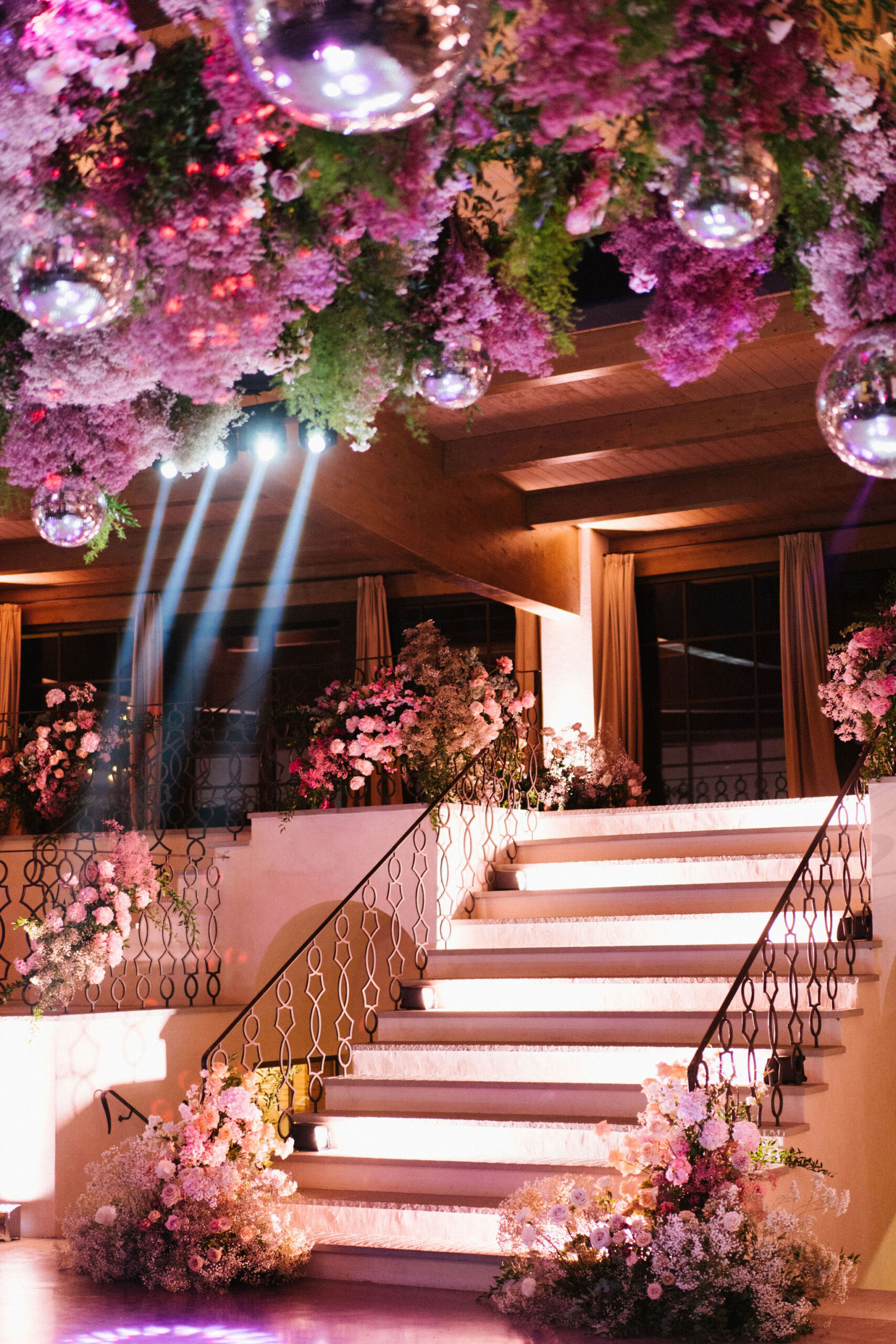 As night fell, guests stepped into a modern yet romantic reception adorned with suspended florals, candlelight, and glowing disco balls. Sage linens, gold accents, and lush blooms created an atmosphere that was refined yet vibrant. The hora brought electrifying joy, lifting the couple high above the dance floor.
