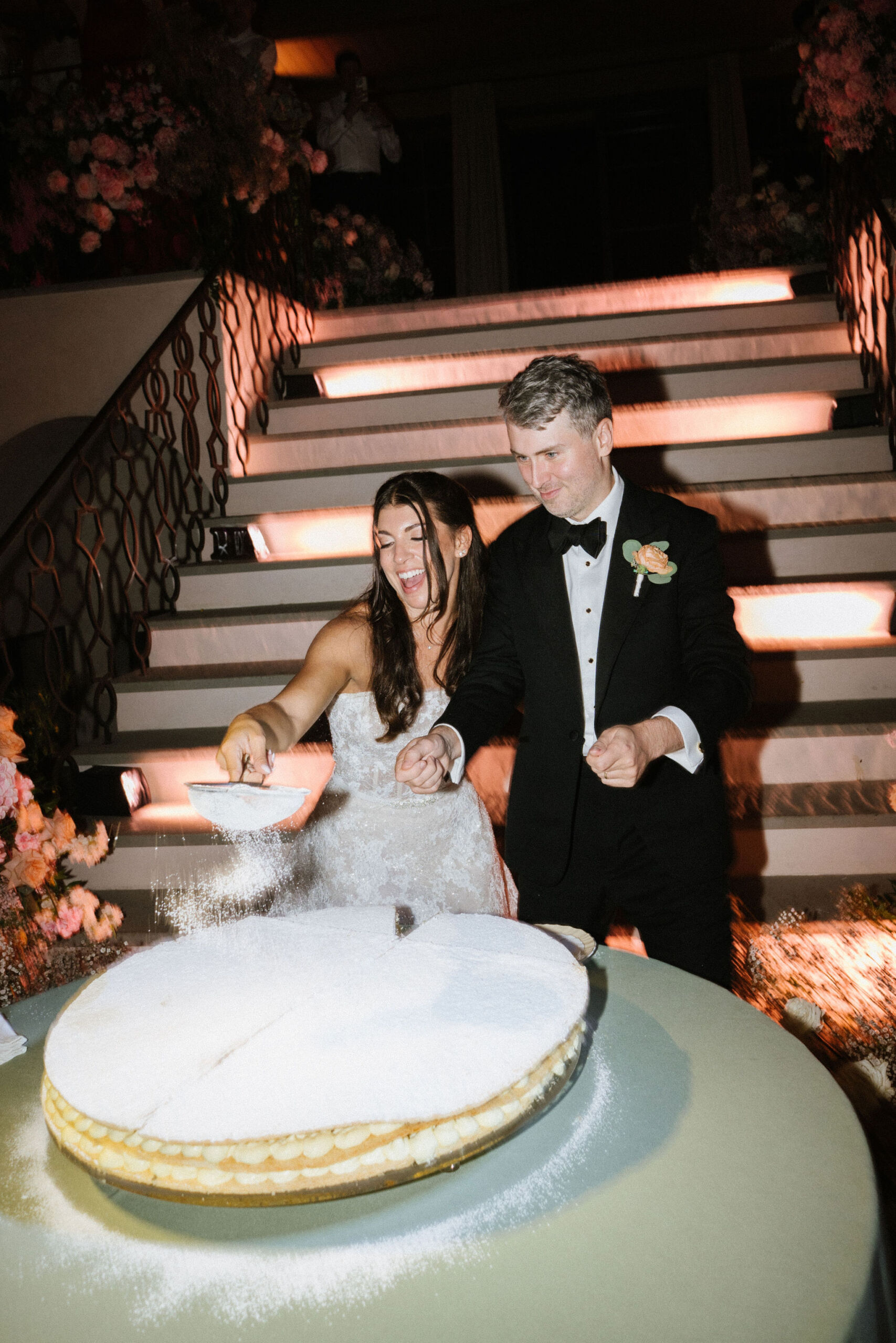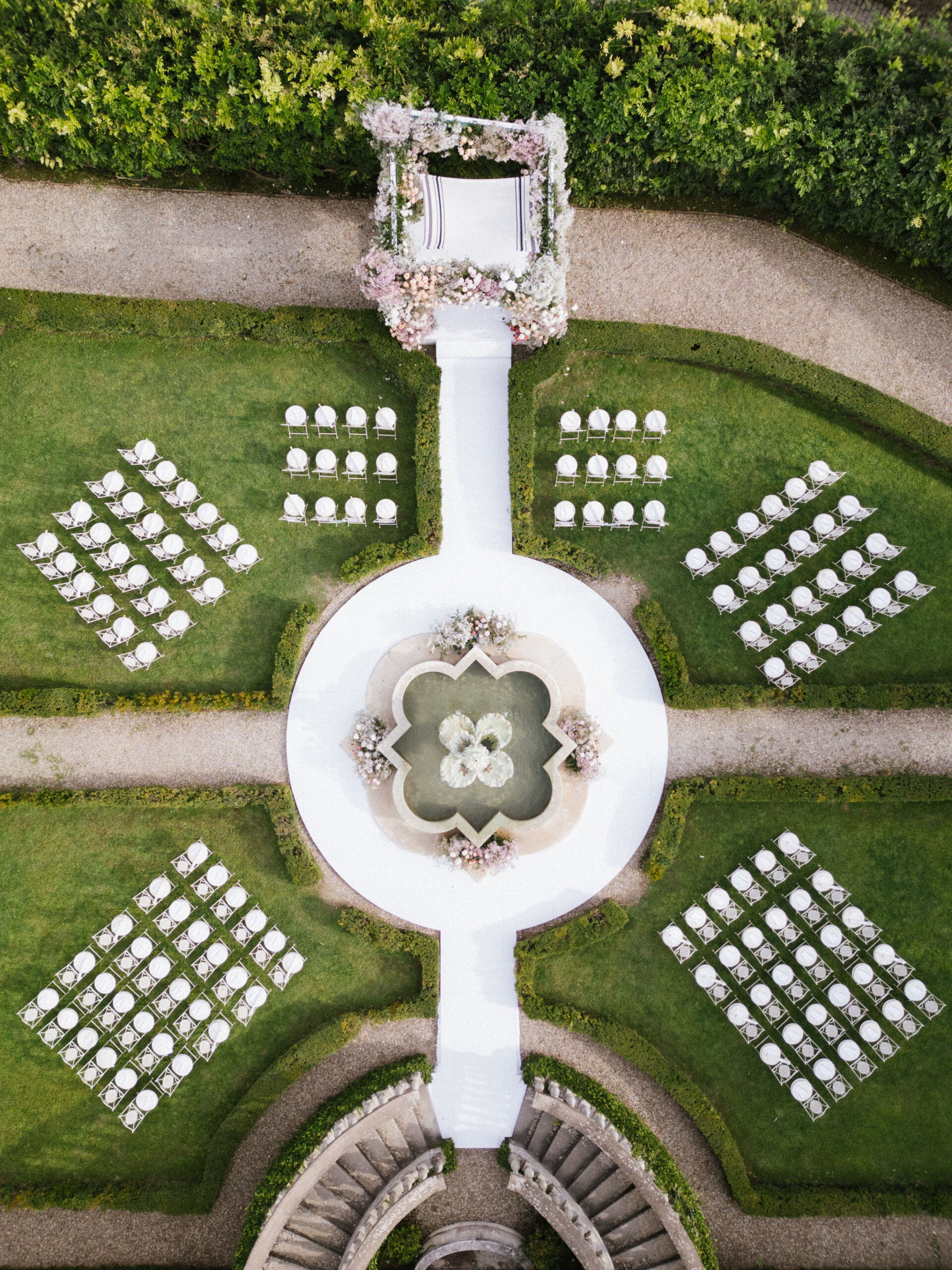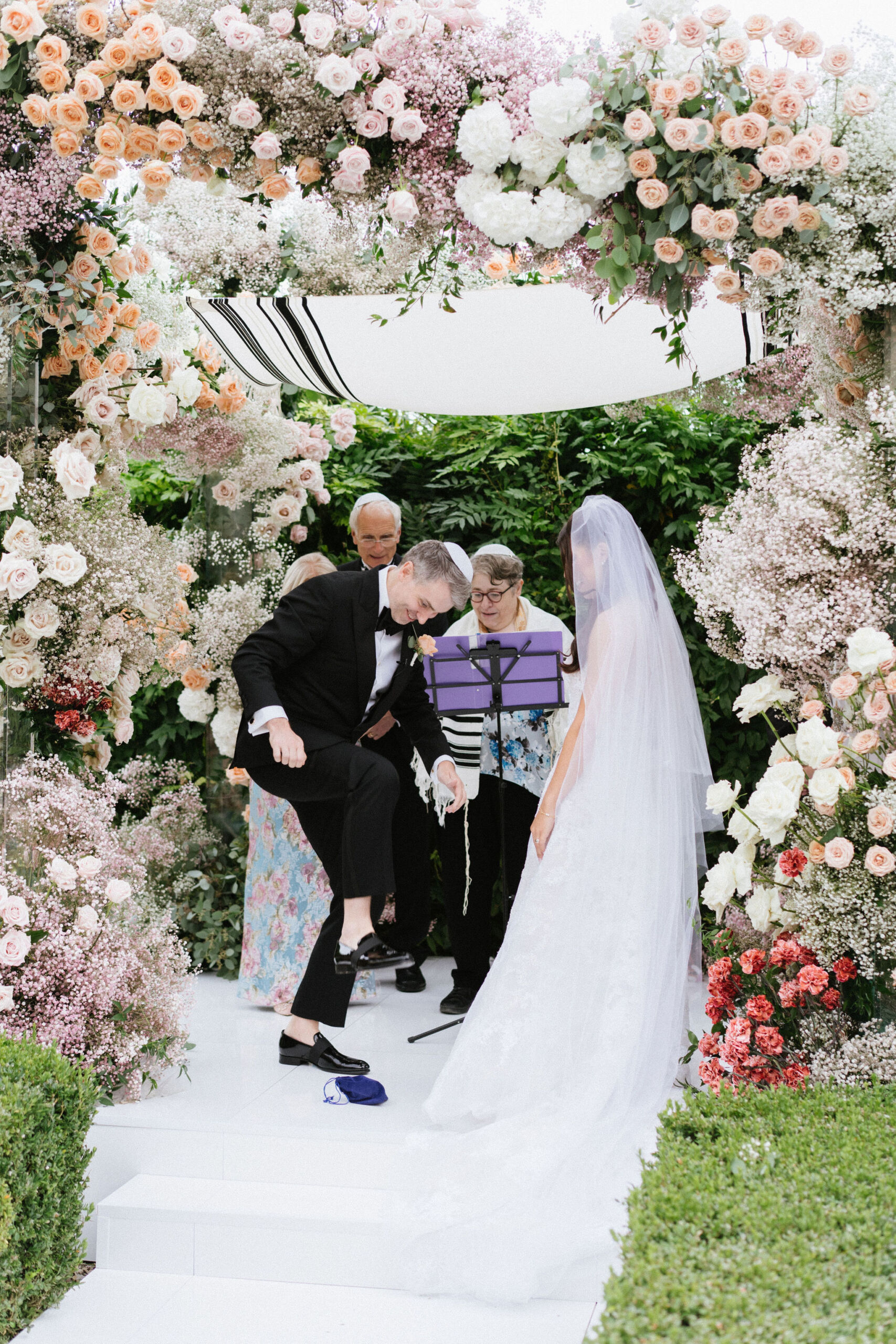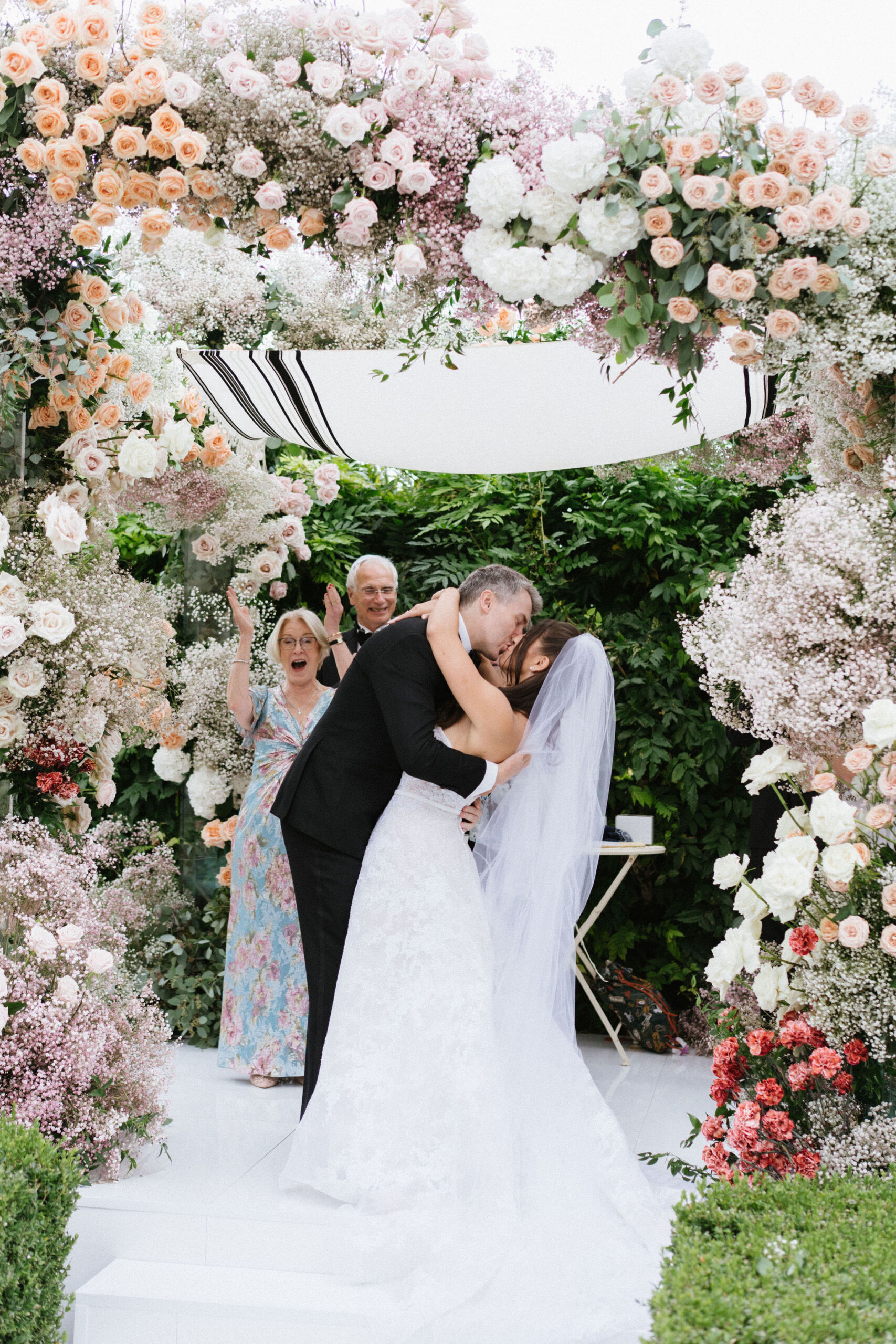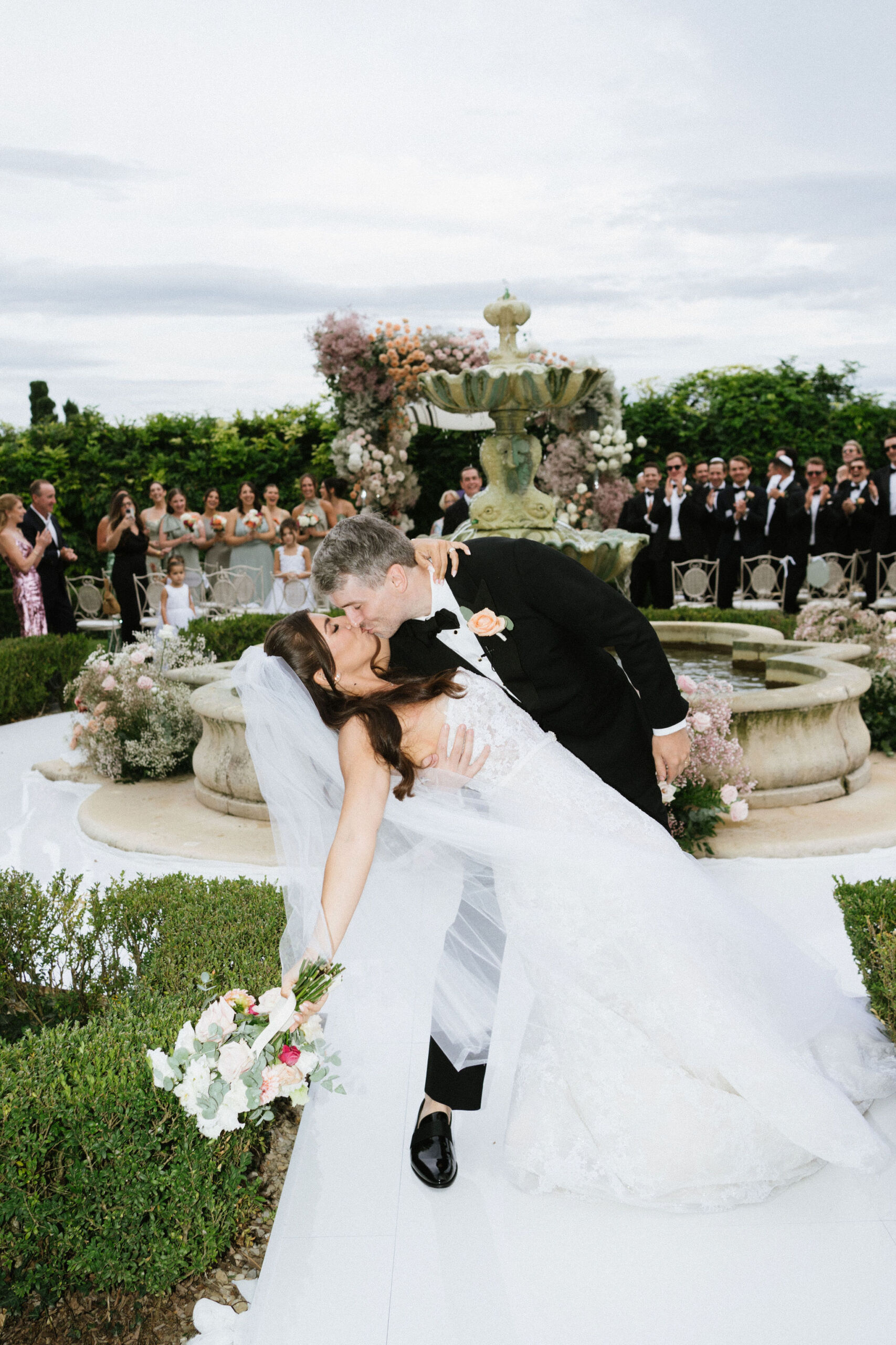 The ceremony took place on Il Borro’s terrace, overlooking the estate’s iconic landscape. A sculptural chuppah—filled with roses, baby’s breath, hydrangea, and pastel tones—framed this emotional Jewish wedding in Italy. The breaking of the glass was met with cheers and sweeping views of the Tuscan countryside.