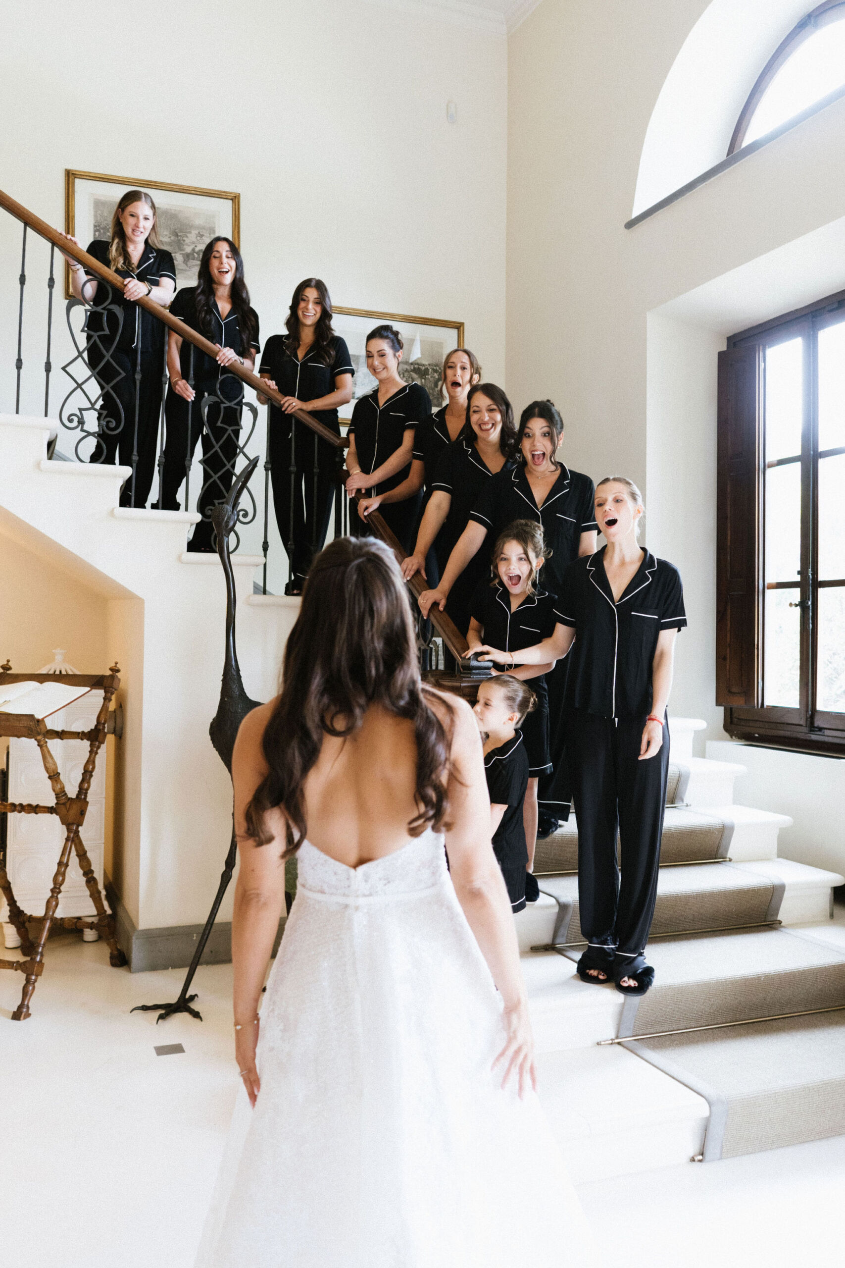 The day began inside one of Il Borro’s beautifully restored villas, where the bride prepared with her closest friends. Their minimalist, coordinated looks and the soft Tuscan light created a serene and stylish start to this luxury wedding at Il Borro.